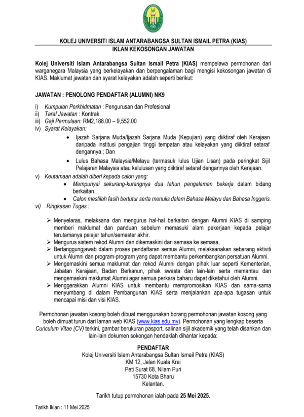 Iklan Kini Jawatan Kosong Kolej Universiti Islam Antarabangsa Sultan Ismail Petra (KIAS) Like serta Ikut Facebook Kami, follow Chanel WhatsApp Jawatan Kosong & Telegram Portal SPA9 untuk capaian pantas kekosongan jawatan daripada kami sekarang. Klik Jawatan Disini