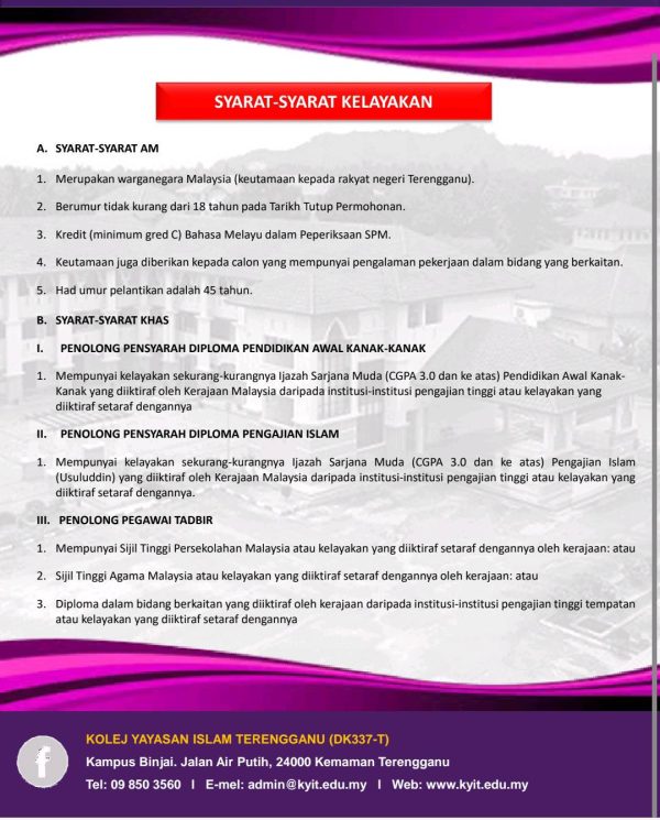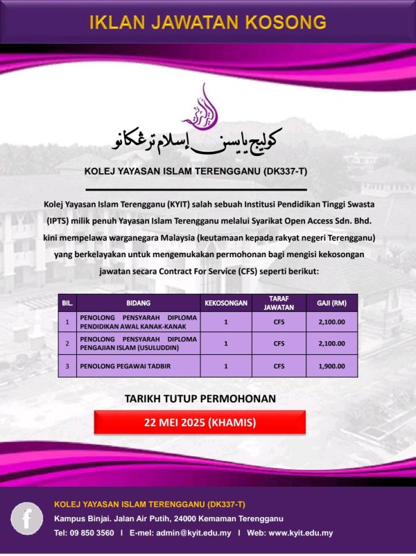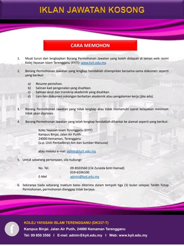 Iklan Kini Jawatan Kosong Kolej Yayasan Islam Terengganu (KYIT) Klik Jawatan Disini Like serta Ikut Facebook Kami, follow Chanel WhatsApp Jawatan Kosong & Telegram Portal SPA9 untuk capaian pantas kekosongan jawatan daripada kami sekarang.