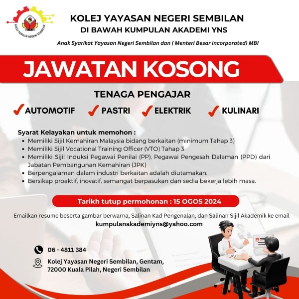 Iklan Kini Jawatan Kosong Kolej Yayasan Negeri Sembilan Like serta Ikut Facebook Kami, follow Chanel WhatsApp Jawatan Kosong & Telegram Portal SPA9 untuk capaian pantas kekosongan jawatan daripada kami sekarang. Klik Iklan Jawatan