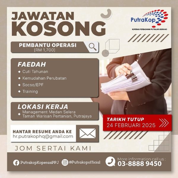 Iklan Kini Jawatan Kosong Koperasi Perbadanan Putrajaya Berhad (PutraKop) Like serta Ikut Facebook Kami, follow Chanel WhatsApp Jawatan Kosong & Telegram Portal SPA9 untuk capaian pantas kekosongan jawatan daripada kami sekarang. Klik Jawatan Disini