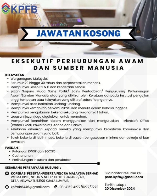 Iklan Kini Jawatan Kosong Koperasi Peserta-Peserta FELCRA Malaysia Berhad Like serta Ikut Facebook Kami, follow Chanel WhatsApp Jawatan Kosong & Telegram Portal SPA9 untuk capaian pantas kekosongan jawatan daripada kami sekarang. Klik Iklan Jawatan