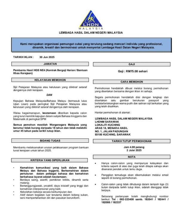Iklan Kini Jawatan Kosong Lembaga Hasil Dalam Negeri Malaysia (LHDNM) Like serta Ikut Facebook Kami, follow Chanel WhatsApp Jawatan Kosong & Telegram Portal SPA9 untuk capaian pantas kekosongan jawatan daripada kami sekarang.
