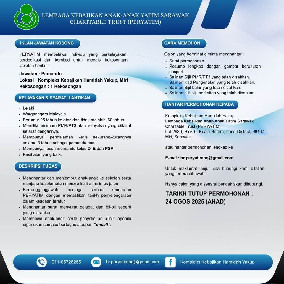 Iklan Kini Jawatan Kosong Lembaga Kebajikan Anak-Anak Yatim Sarawak (PERYATIM) Like serta Ikut Facebook Kami, follow Chanel WhatsApp Jawatan Kosong & Telegram Portal SPA9 untuk capaian pantas kekosongan jawatan daripada kami sekarang. Klik Iklan Disini