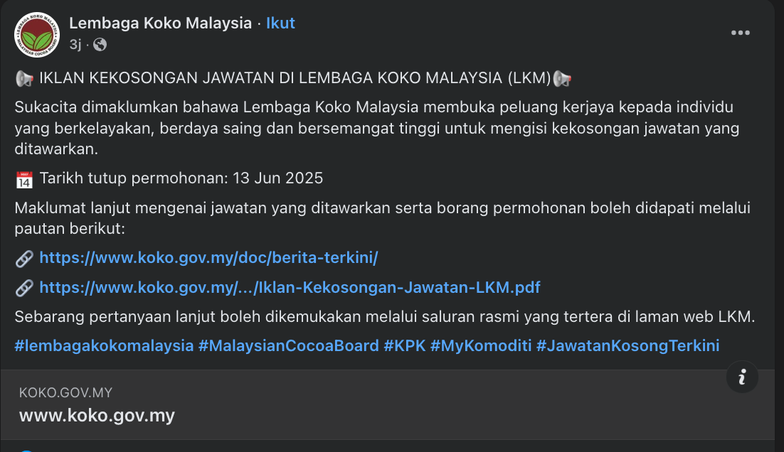 Iklan Kini Jawatan Kosong Lembaga Koko Malaysia Like serta Ikut Facebook Kami, follow Chanel WhatsApp Jawatan Kosong & Telegram Portal SPA9 untuk capaian pantas kekosongan jawatan daripada kami sekarang. Klik Jawatan Disini