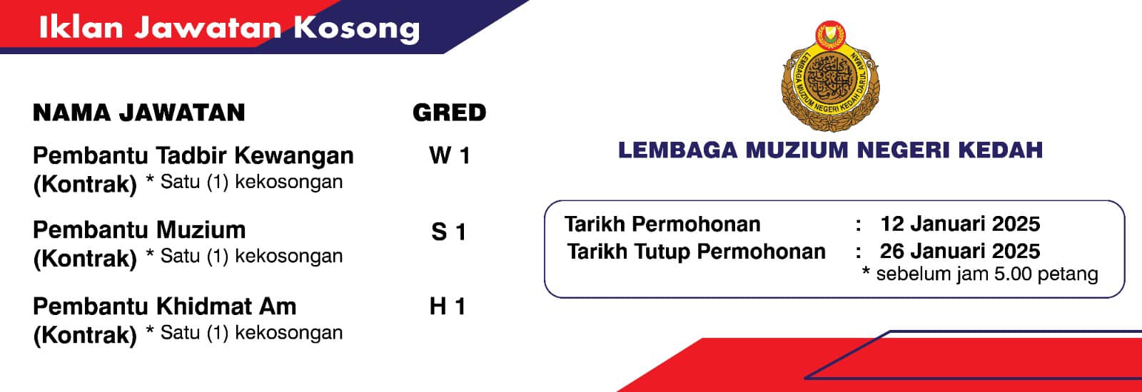 Iklan Kini Jawatan Kosong Lembaga Muzium Negeri Kedah Like serta Ikut Facebook Kami, follow Chanel WhatsApp Jawatan Kosong & Telegram Portal SPA9 untuk capaian pantas kekosongan jawatan daripada kami sekarang. Klik Iklan Jawatan