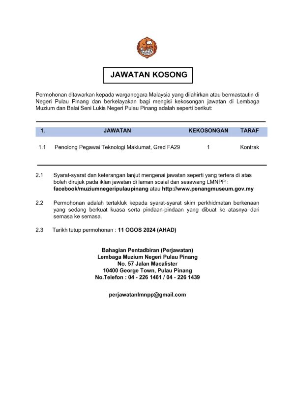 Iklan Kini Jawatan Kosong Lembaga Muzium Negeri Pulau Pinang (LMNPP) Like serta Ikut Facebook Kami, follow Chanel WhatsApp Jawatan Kosong & Telegram Portal SPA9 untuk capaian pantas kekosongan jawatan daripada kami sekarang. Klik Jawatan Disini