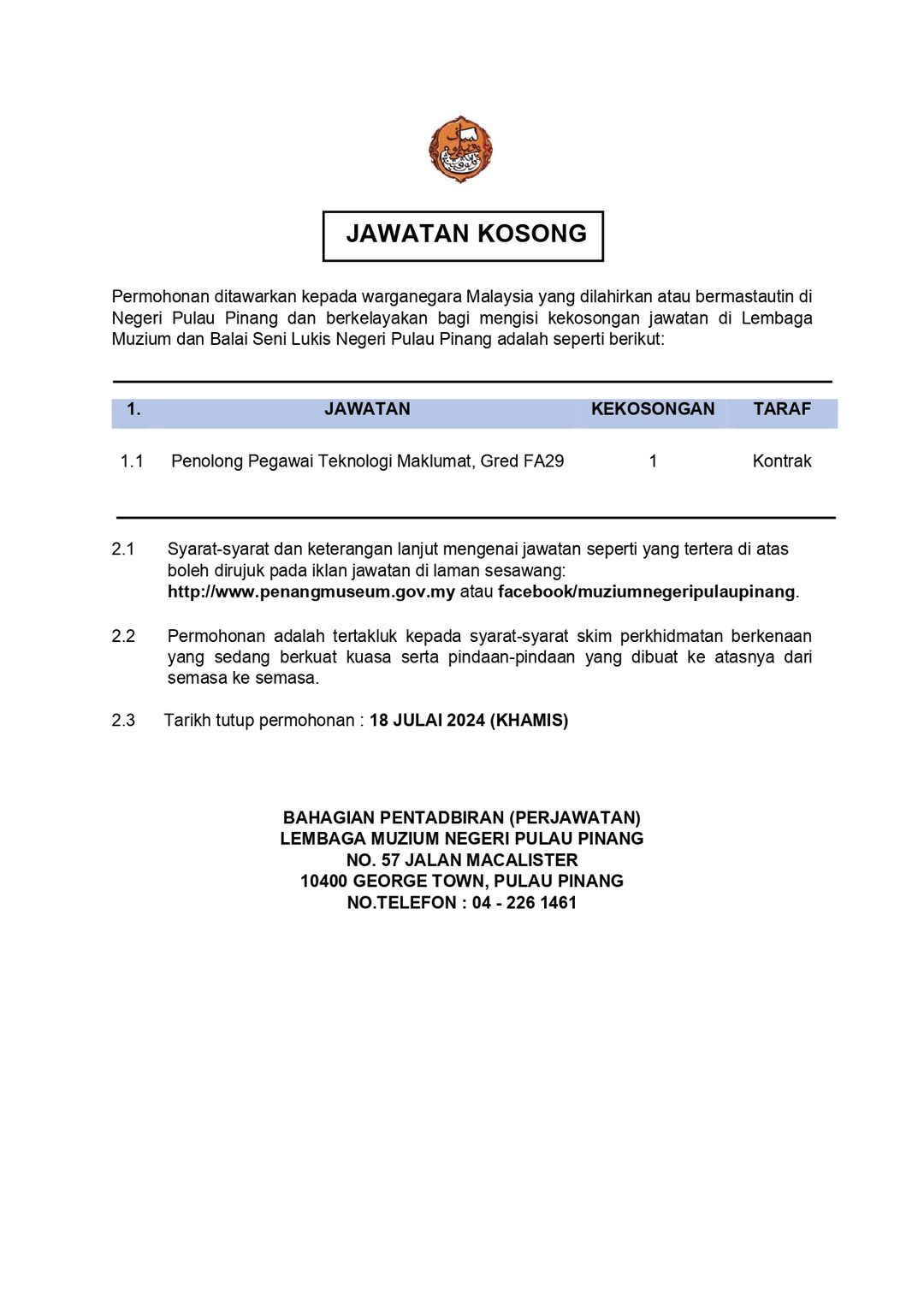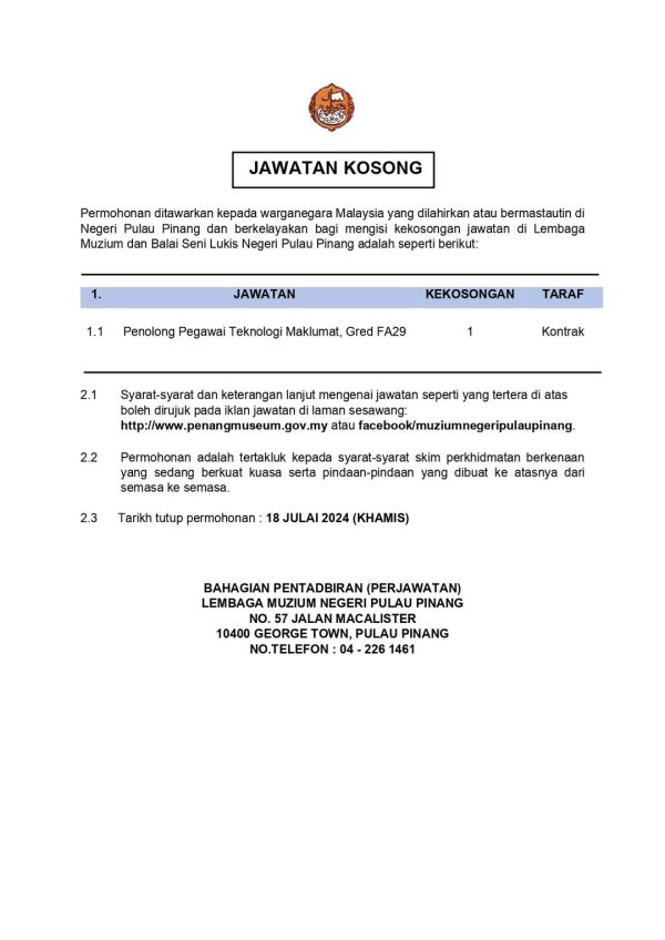 Iklan Kini Jawatan Kosong Lembaga Muzium Negeri Pulau Pinang (LMNPP) Like serta Ikut Facebook Kami, follow Chanel WhatsApp Jawatan Kosong & Telegram Portal SPA9 untuk capaian pantas kekosongan jawatan daripada kami sekarang. Klik Jawatan Disini