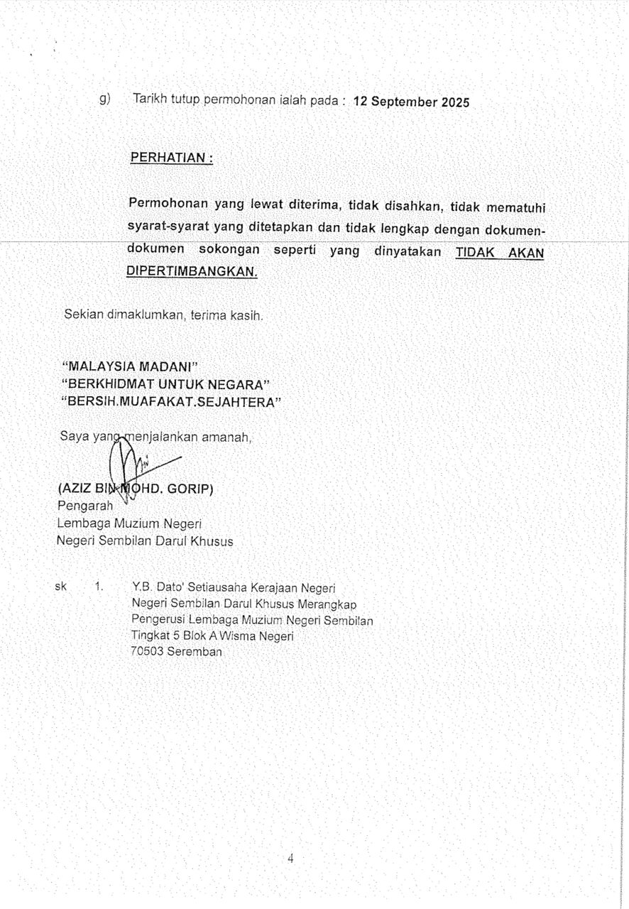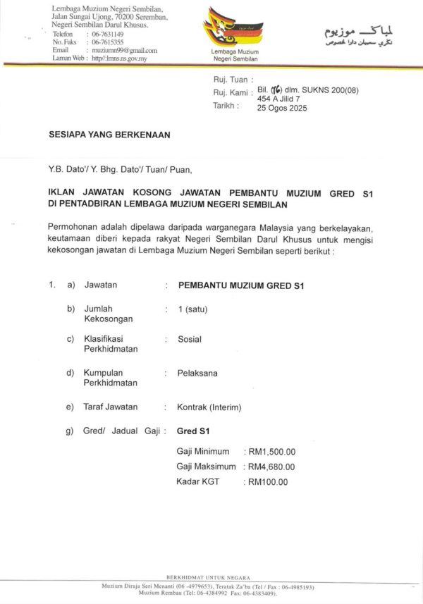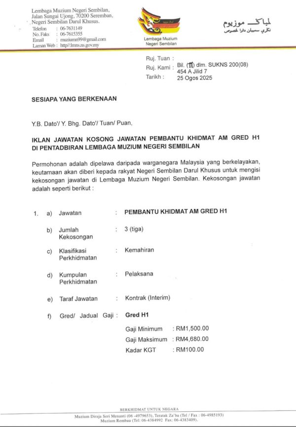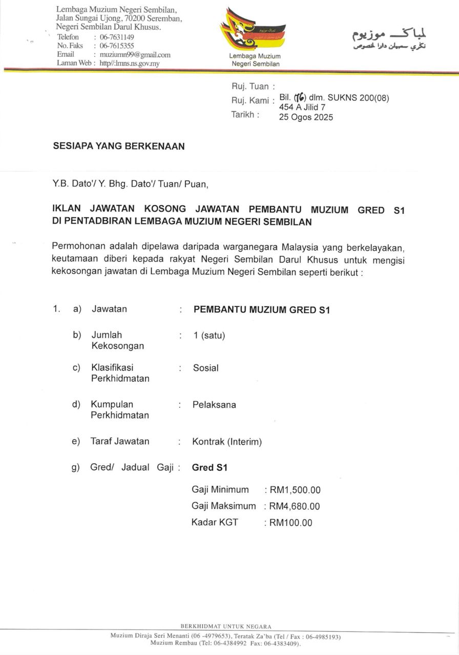 Iklan Kini Jawatan Kosong Lembaga Muzium Negeri Sembilan Like serta Ikut Facebook Kami, follow Chanel WhatsApp Jawatan Kosong & Telegram Portal SPA9 untuk capaian pantas kekosongan jawatan daripada kami sekarang. Klik Iklan Disini