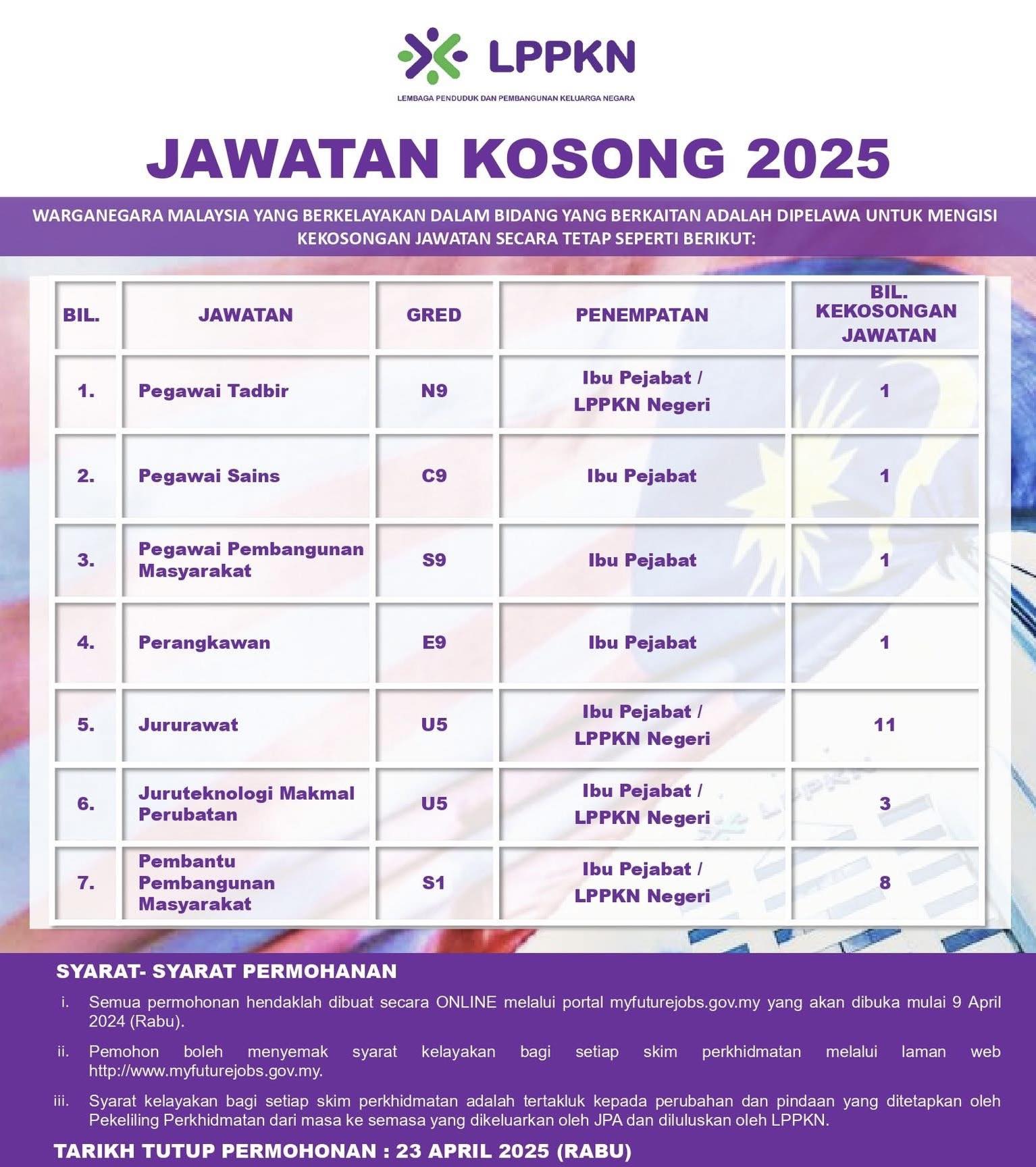 Iklan Kini Jawatan Kosong Lembaga Penduduk Dan Pembangunan Keluarga Negara (LPPKN) Like serta Ikut Facebook Kami, follow Chanel WhatsApp Jawatan Kosong & Telegram Portal SPA9 untuk capaian pantas kekosongan jawatan daripada kami sekarang.