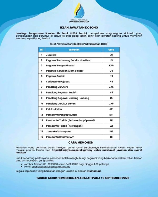 Iklan Kini Jawatan Kosong Lembaga Pengurusan Sumber Air Perak Like serta Ikut Facebook Kami, follow Chanel WhatsApp Jawatan Kosong & Telegram Portal SPA9 untuk capaian pantas kekosongan jawatan daripada kami sekarang. Klik Iklan Disini