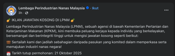 Iklan Kini Jawatan Kosong Lembaga Perindustrian Nanas Malaysia (LPNM) Like serta Ikut Facebook Kami, follow Chanel WhatsApp Jawatan Kosong & Telegram Portal SPA9 untuk capaian pantas kekosongan jawatan daripada kami sekarang. Klik Iklan Jawatan