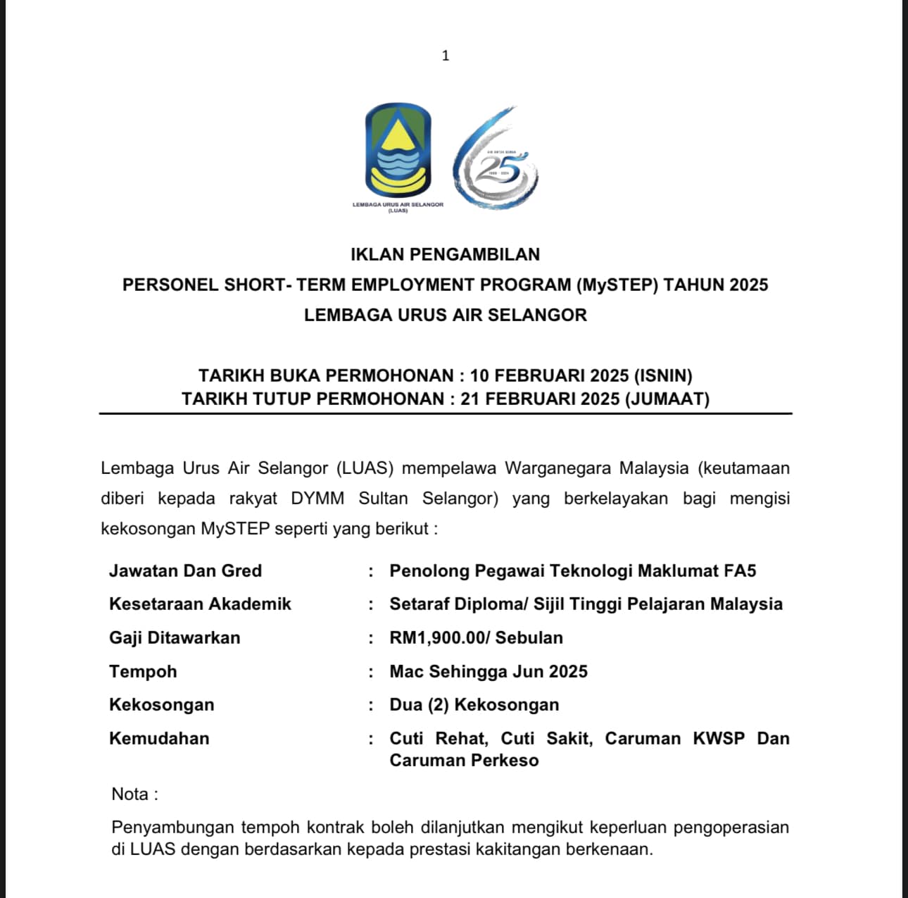 Iklan Kini Jawatan Kosong Lembaga Urus Air Selangor (LUAS) Klik Jawatan Disini Like serta Ikut Facebook Kami, follow Chanel WhatsApp Jawatan Kosong & Telegram Portal SPA9 untuk capaian pantas kekosongan jawatan daripada kami sekarang.