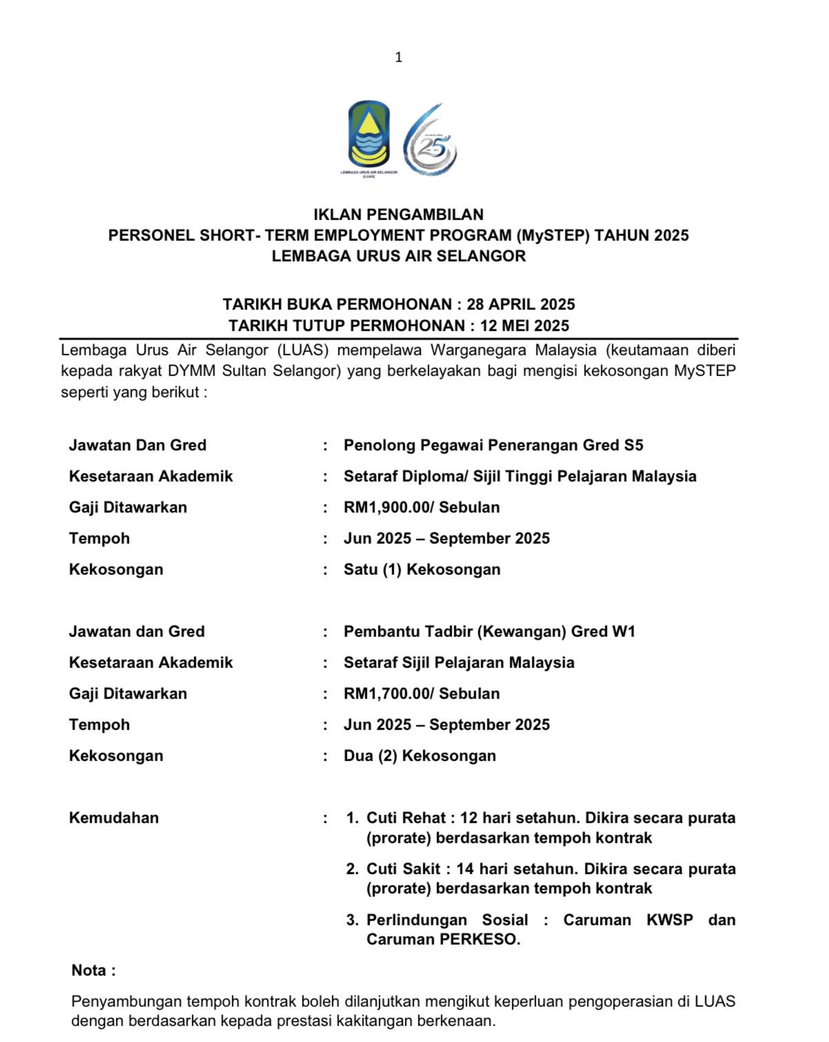 Iklan Kini Jawatan Kosong Lembaga Urus Air Selangor (LUAS) Klik Jawatan Disini Like serta Ikut Facebook Kami, follow Chanel WhatsApp Jawatan Kosong & Telegram Portal SPA9 untuk capaian pantas kekosongan jawatan daripada kami sekarang.