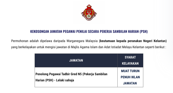 Iklan Kini Jawatan Kosong Majlis Agama Islam dan Adat Istiadat Melayu Kelantan (MAIK) Like serta Ikut Facebook Kami, follow Chanel WhatsApp Jawatan Kosong & Telegram Portal SPA9 untuk capaian pantas kekosongan jawatan daripada kami sekarang. Klik Jawatan Disini