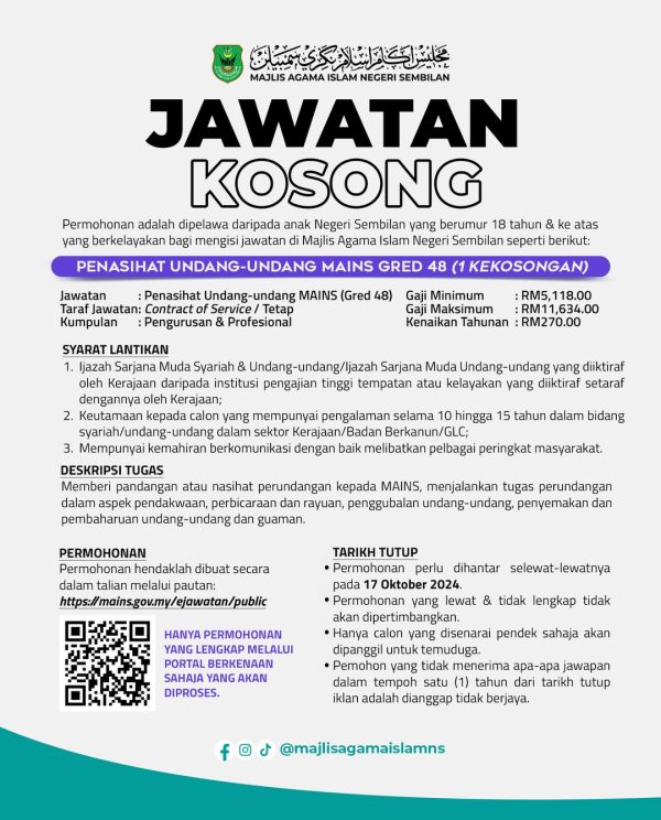 Iklan Kini Jawatan Kosong Majlis Agama Islam Negeri Sembilan (MAINS) Like serta Ikut Facebook Kami, follow Chanel WhatsApp Jawatan Kosong & Telegram Portal SPA9 untuk capaian pantas kekosongan jawatan daripada kami sekarang. Klik Jawatan Disini