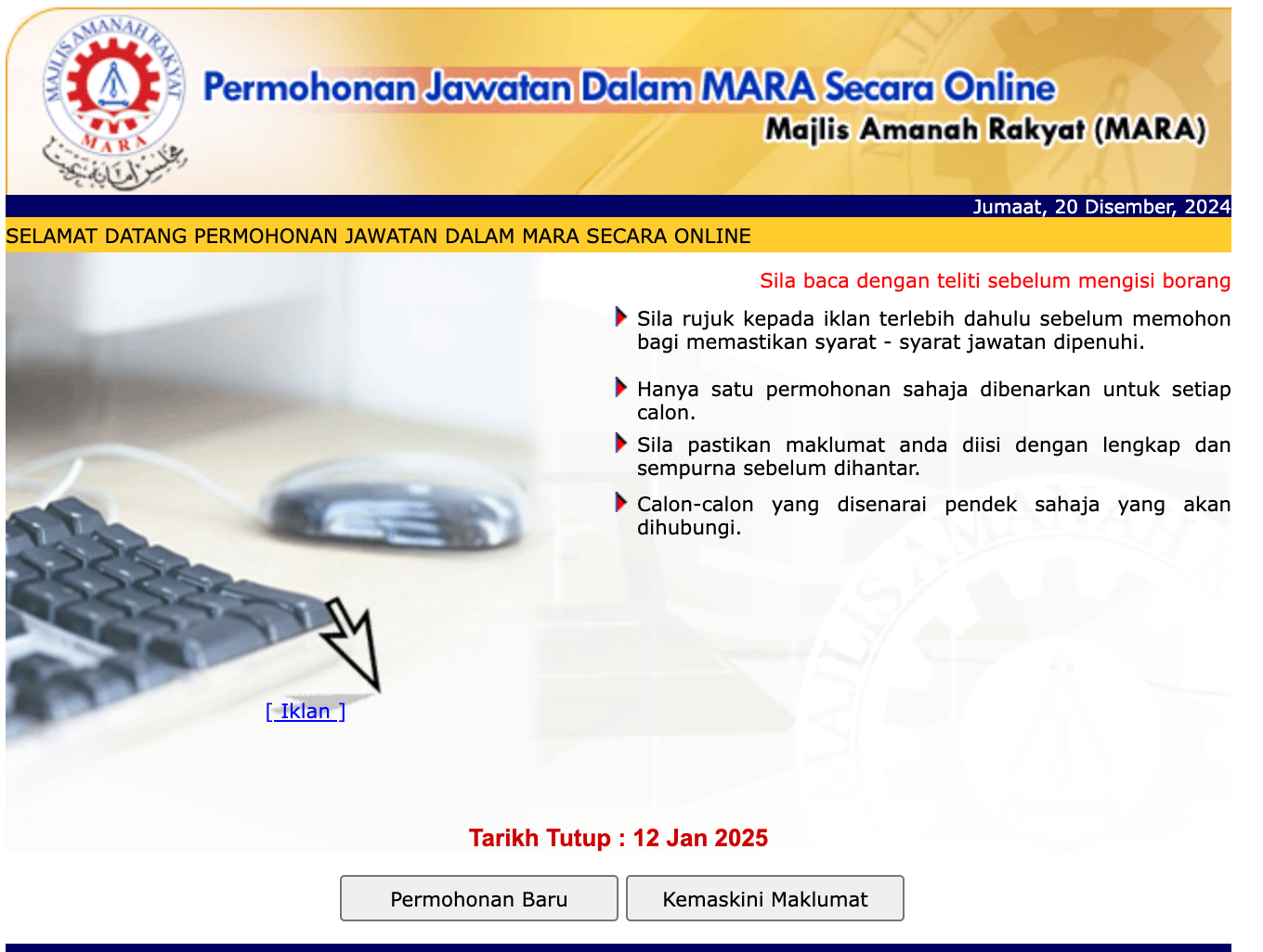Iklan Kini Jawatan Kosong Majlis Amanah Rakyat (MARA) Like serta Ikut Facebook Kami, follow Chanel WhatsApp Jawatan Kosong & Telegram Portal SPA9 untuk capaian pantas kekosongan jawatan daripada kami sekarang. Klik Iklan Jawatan