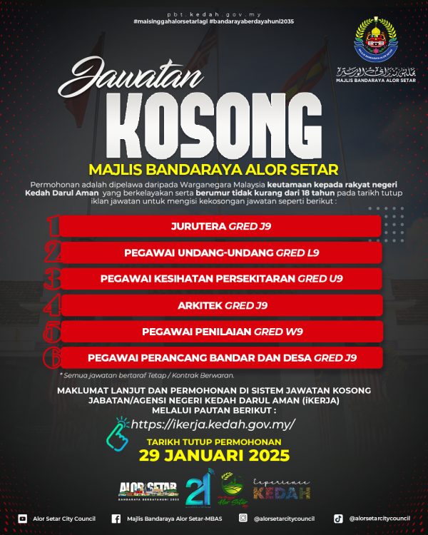 Iklan Kini Jawatan Kosong Majlis Bandaraya Alor Setar (MBAS) Like serta Ikut Facebook Kami, follow Chanel WhatsApp Jawatan Kosong & Telegram Portal SPA9 untuk capaian pantas kekosongan jawatan daripada kami sekarang. Klik Iklan Jawatan