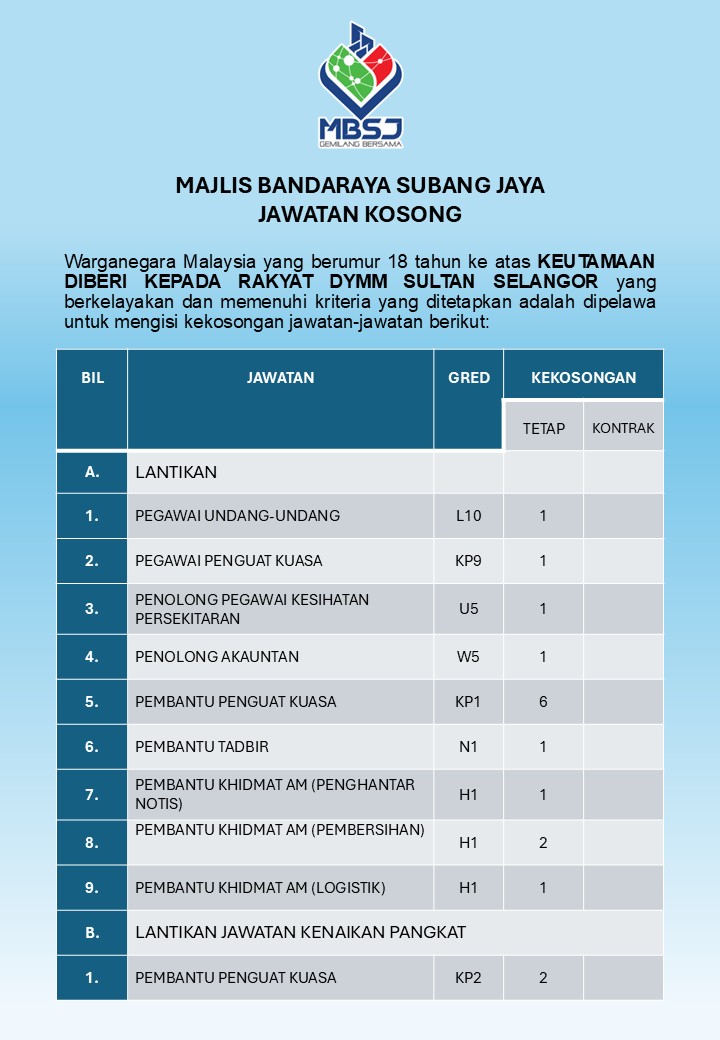 Iklan Kini Jawatan Kosong Majlis Bandaraya Subang Jaya (MBSJ) Like serta Ikut Facebook Kami, follow Chanel WhatsApp Jawatan Kosong & Telegram Portal SPA9 untuk capaian pantas kekosongan jawatan daripada kami sekarang. Klik Jawatan Disini