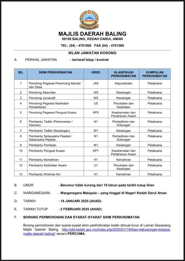 Iklan Kini Jawatan Kosong Majlis Daerah Baling Like serta Ikut Facebook Kami, follow Chanel WhatsApp Jawatan Kosong & Telegram Portal SPA9 untuk capaian pantas kekosongan jawatan daripada kami sekarang. Klik Iklan Kini