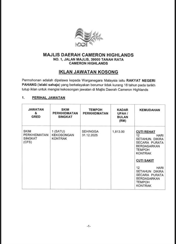 Iklan Kini Jawatan Kosong Majlis Daerah Cameron Highlands Klik Iklan Jawatan Like serta Ikut Facebook Kami, follow Chanel WhatsApp Jawatan Kosong & Telegram Portal SPA9 untuk capaian pantas kekosongan jawatan daripada kami sekarang.