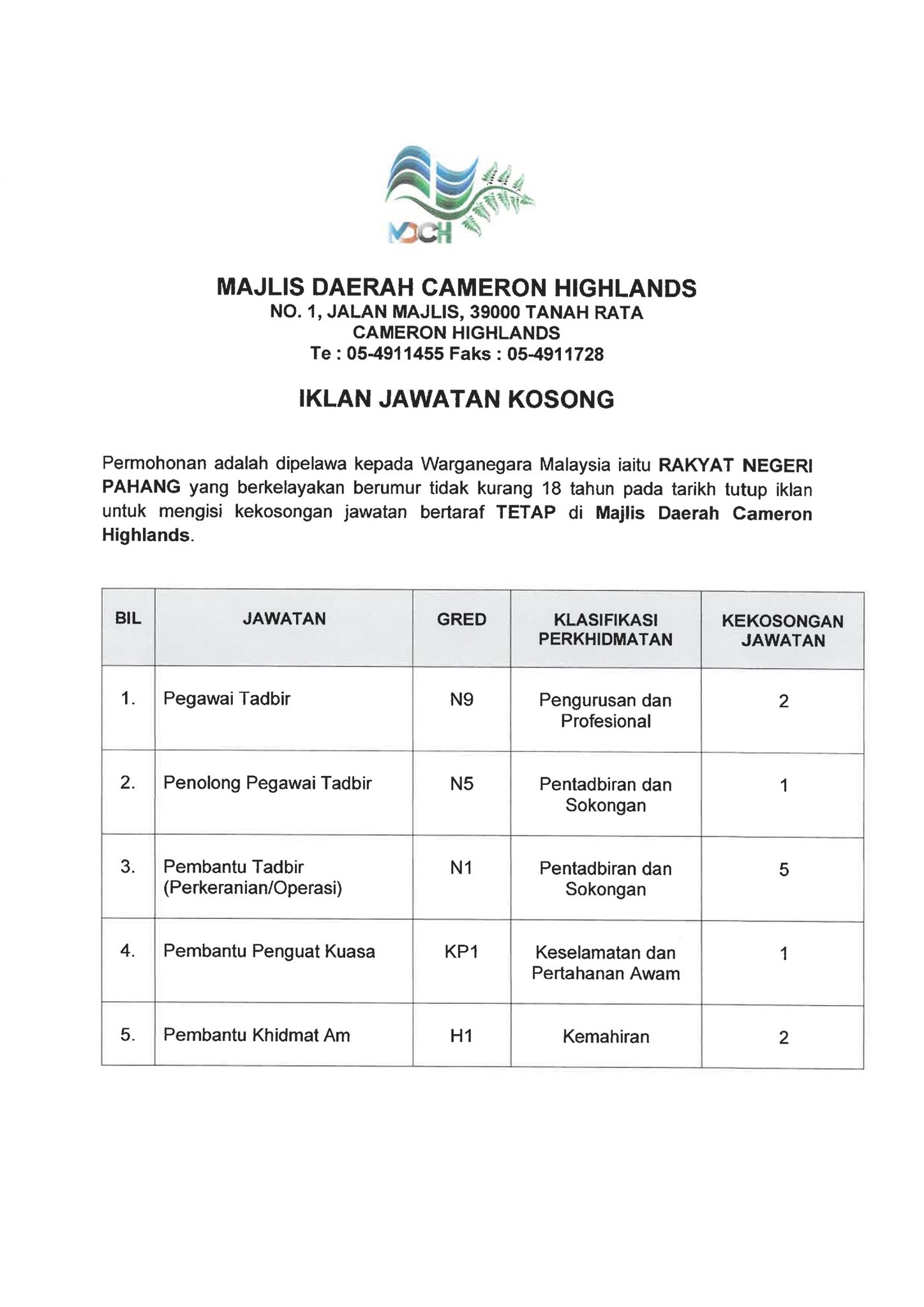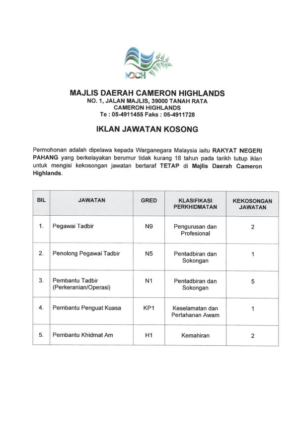 Iklan Kini Jawatan Kosong Majlis Daerah Cameron Highlands Klik Jawatan Disini Like serta Ikut Facebook Kami, follow Chanel WhatsApp Jawatan Kosong & Telegram Portal SPA9 untuk capaian pantas kekosongan jawatan daripada kami sekarang.