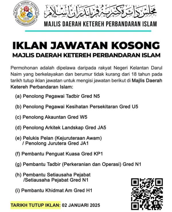 Iklan Kini Jawatan Kosong Majlis Daerah Ketereh Perbandaran Islam Like serta Ikut Facebook Kami, follow Chanel WhatsApp Jawatan Kosong & Telegram Portal SPA9 untuk capaian pantas kekosongan jawatan daripada kami sekarang. Klik Iklan Jawatan
