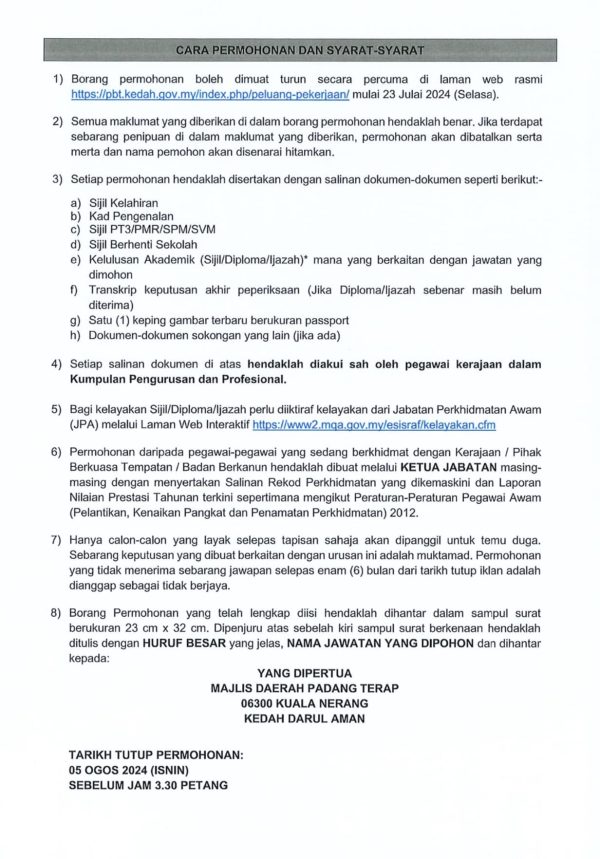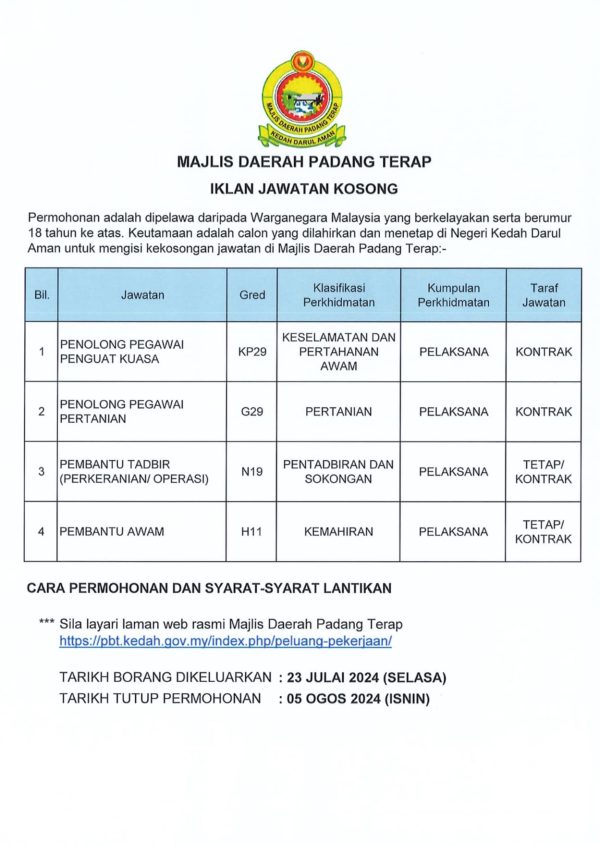 Iklan Kini Jawatan Kosong Majlis Daerah Padang Terap Like serta Ikut Facebook Kami, follow Chanel WhatsApp Jawatan Kosong & Telegram Portal SPA9 untuk capaian pantas kekosongan jawatan daripada kami sekarang. Iklan Jawatan
