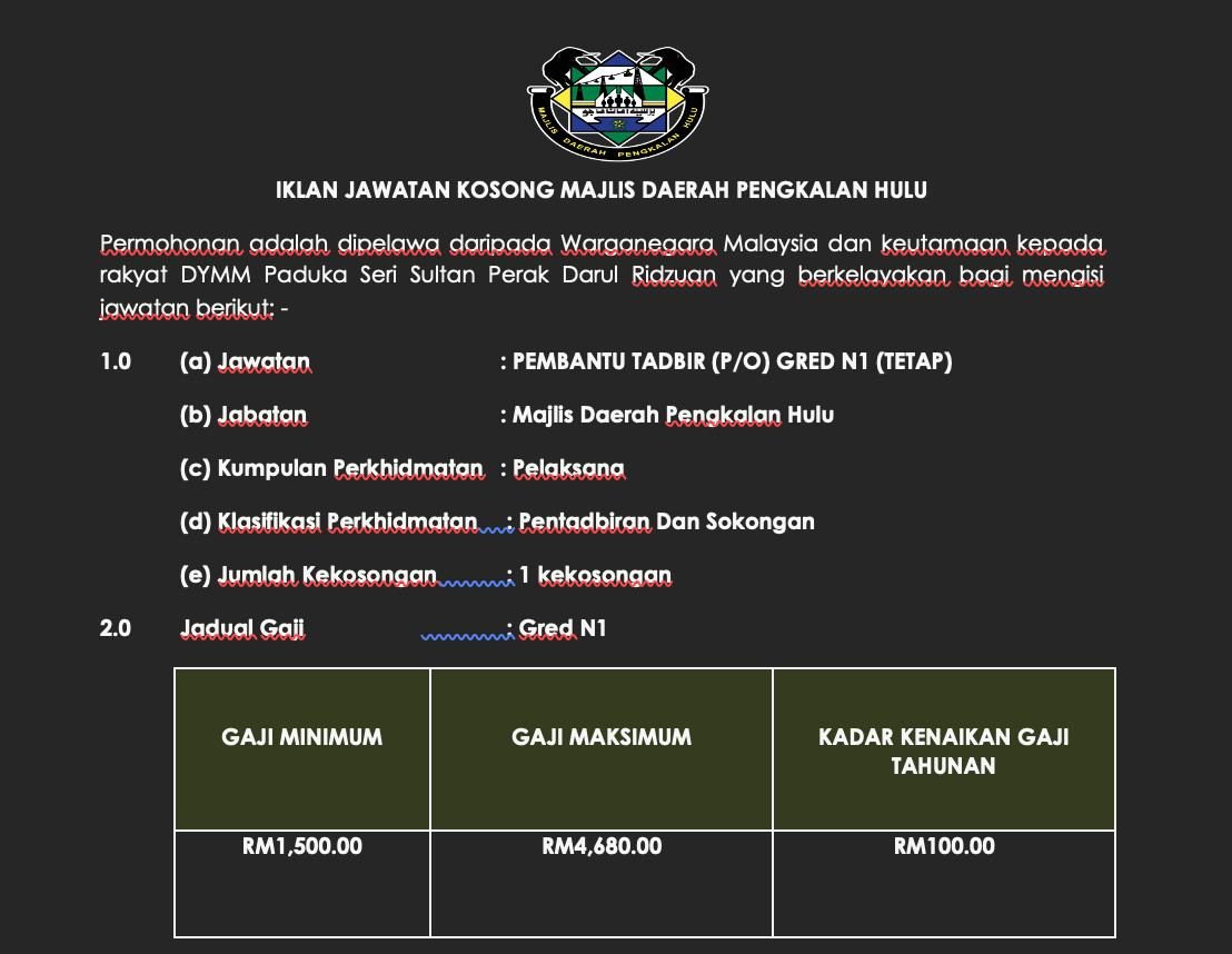 Iklan Kini Jawatan Kosong Majlis Daerah Pengkalan Hulu Like serta Ikut Facebook Kami, follow Chanel WhatsApp Jawatan Kosong & Telegram Portal SPA9 untuk capaian pantas kekosongan jawatan daripada kami sekarang. Klik Iklan Jawatan