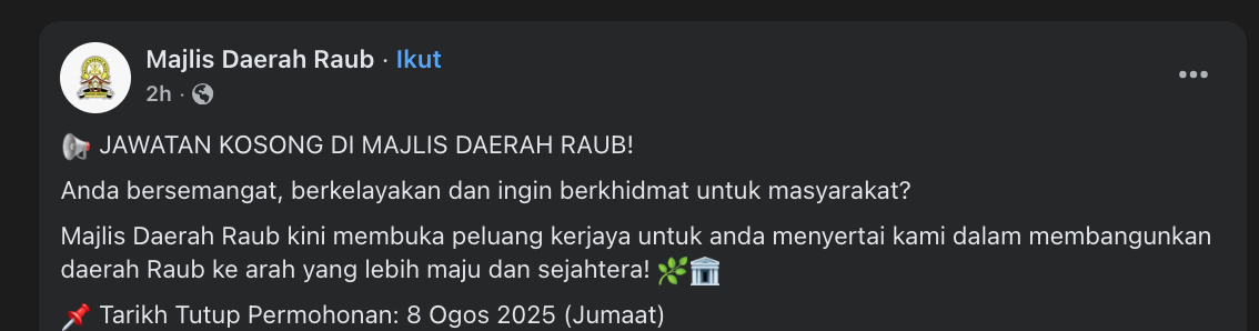 Iklan Kini Jawatan Kosong Majlis Daerah Raub Klik Jawatan Disini Like serta Ikut Facebook Kami, follow Chanel WhatsApp Jawatan Kosong & Telegram Portal SPA9 untuk capaian pantas kekosongan jawatan daripada kami sekarang.