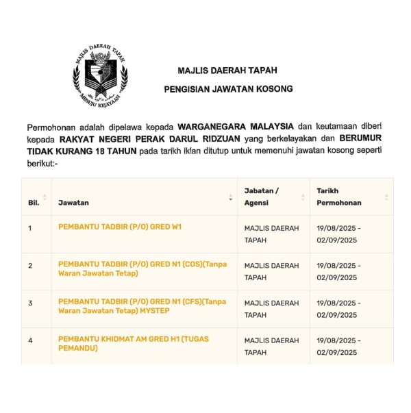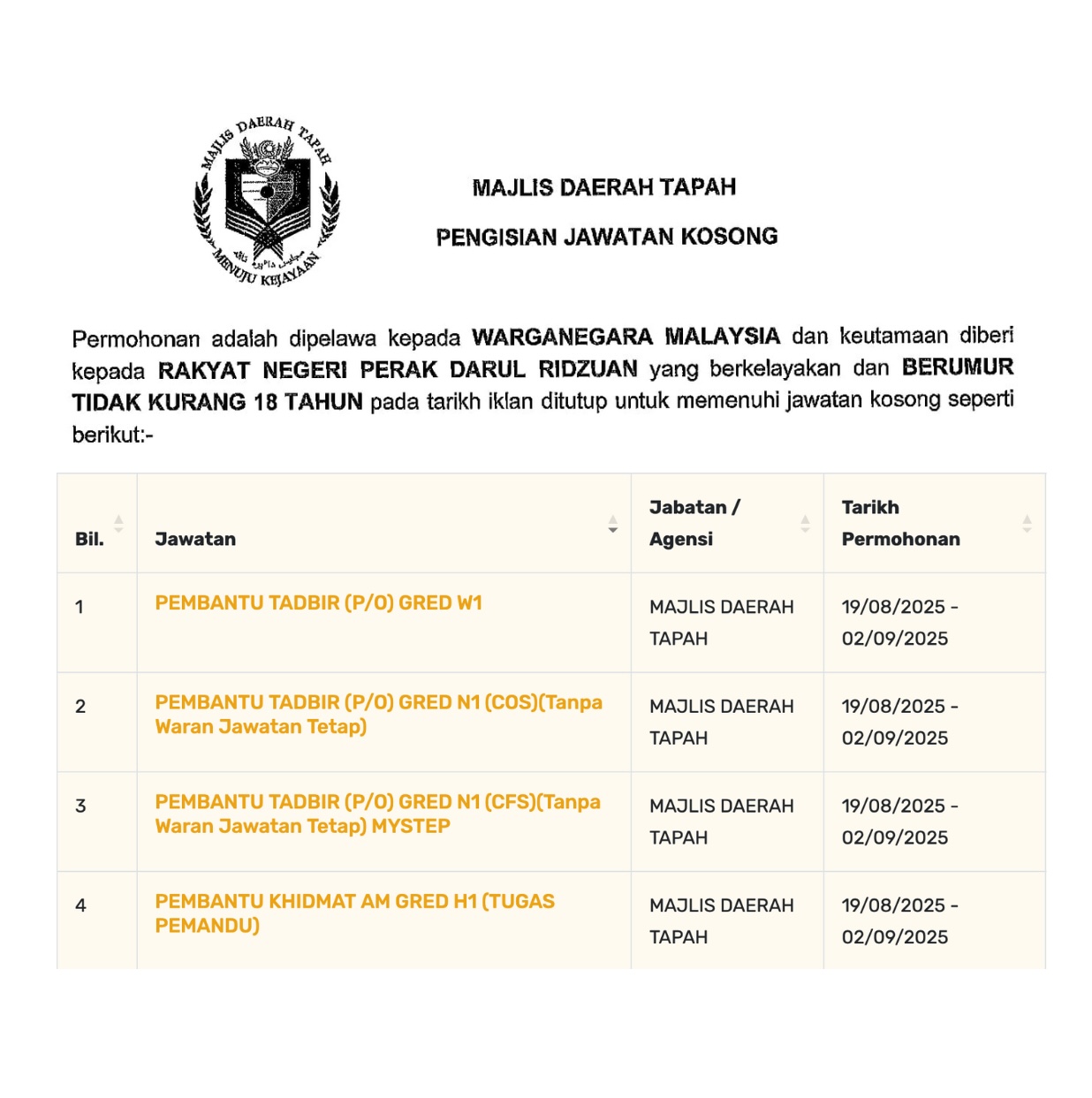 Iklan Kini Jawatan Kosong Majlis Daerah Tapah Like serta Ikut Facebook Kami, follow Chanel WhatsApp Jawatan Kosong & Telegram Portal SPA9 untuk capaian pantas kekosongan jawatan daripada kami sekarang. Klik Iklan Disini