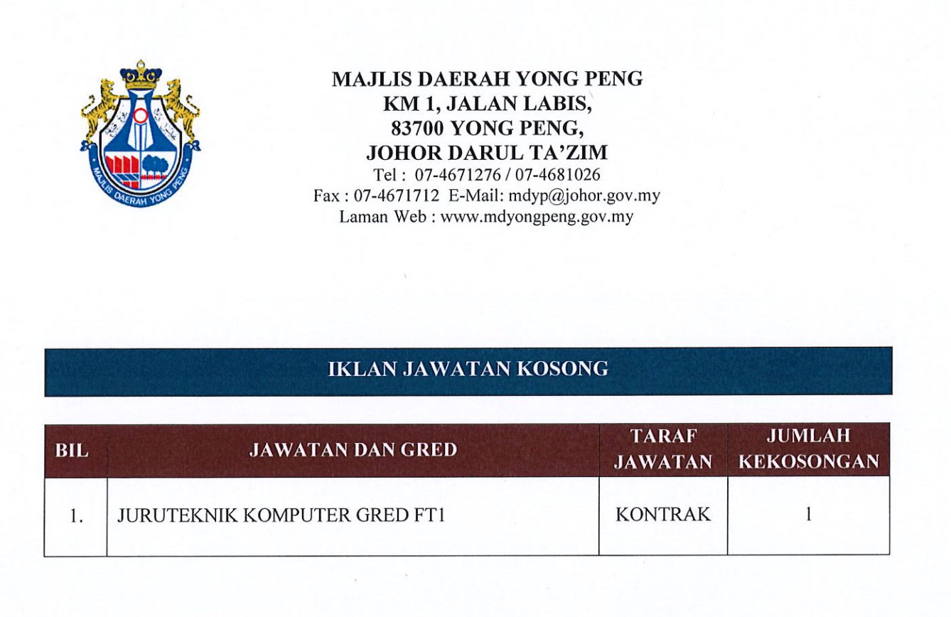 Iklan Kini Jawatan Kosong Majlis Daerah Yong Peng Like serta Ikut Facebook Kami, follow Chanel WhatsApp Jawatan Kosong & Telegram Portal SPA9 untuk capaian pantas kekosongan jawatan daripada kami sekarang. Klik Jawatan Disini
