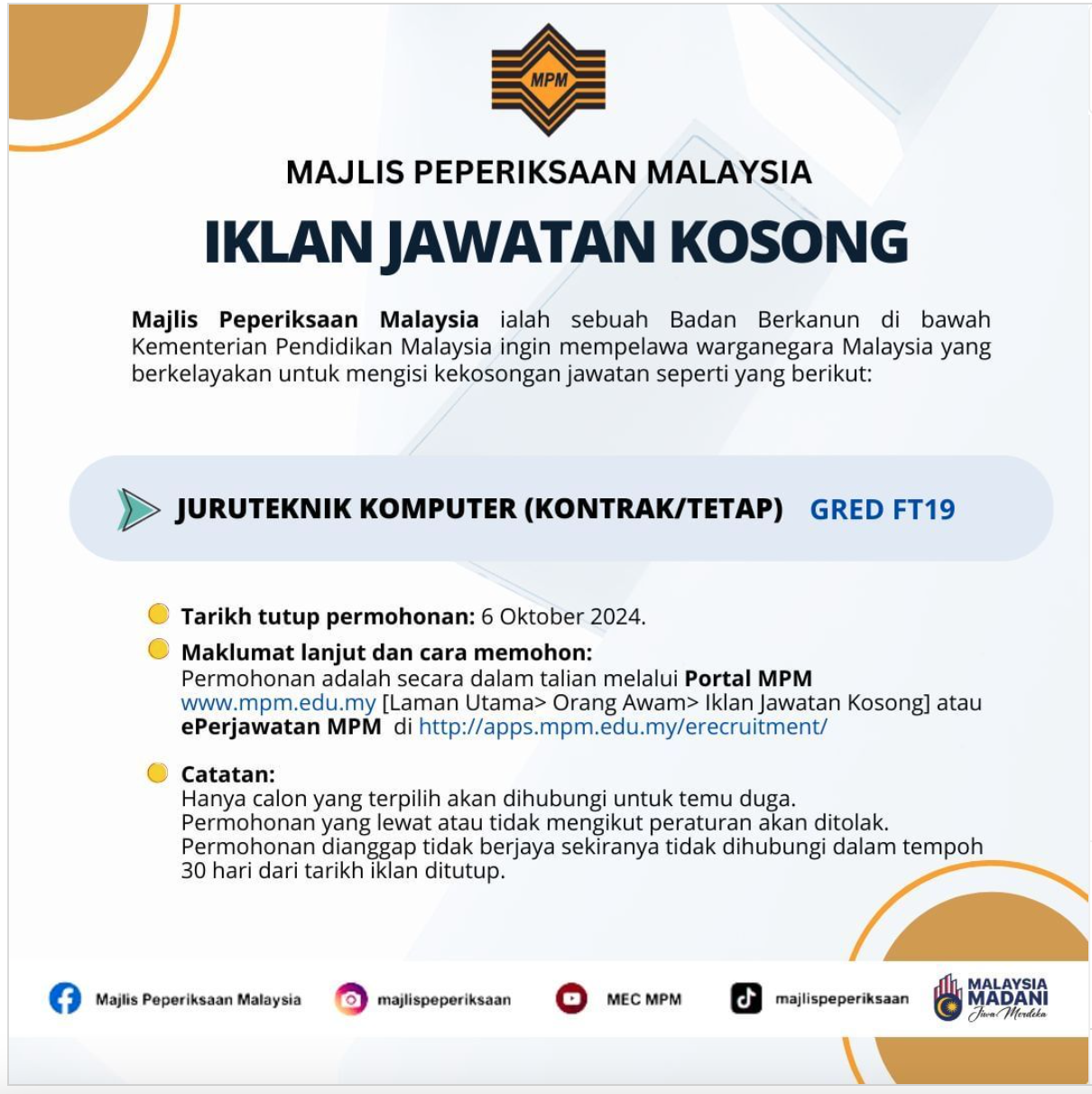 Iklan Kini Jawatan Kosong Majlis Peperiksaan Malaysia (MPM) Like serta Ikut Facebook Kami, follow Chanel WhatsApp Jawatan Kosong & Telegram Portal SPA9 untuk capaian pantas kekosongan jawatan daripada kami sekarang.