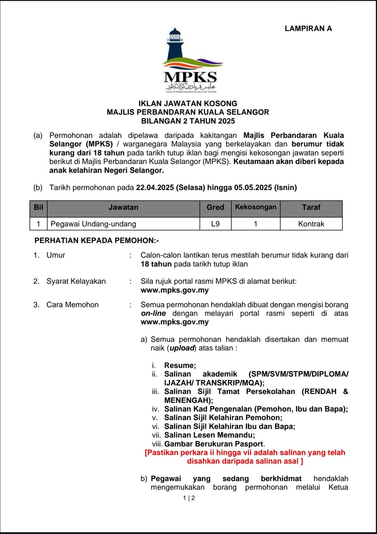 Iklan Kini Jawatan Kosong Majlis Perbandaran Kuala Selangor (MPKS) Klik Jawatan Disini Like serta Ikut Facebook Kami, follow Chanel WhatsApp Jawatan Kosong & Telegram Portal SPA9 untuk capaian pantas kekosongan jawatan daripada kami sekarang.