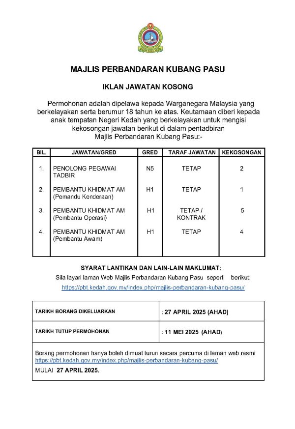 Iklan Kini Jawatan Kosong Majlis Perbandaran Kubang Pasu Klik Iklan Jawatan Like serta Ikut Facebook Kami, follow Chanel WhatsApp Jawatan Kosong & Telegram Portal SPA9 untuk capaian pantas kekosongan jawatan daripada kami sekarang.
