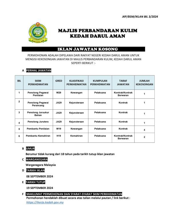 Iklan Kini Jawatan Kosong Majlis Perbandaran Kulim Like serta Ikut Facebook Kami, follow Chanel WhatsApp Jawatan Kosong & Telegram Portal SPA9 untuk capaian pantas kekosongan jawatan daripada kami sekarang. Klik Jawatan Disini