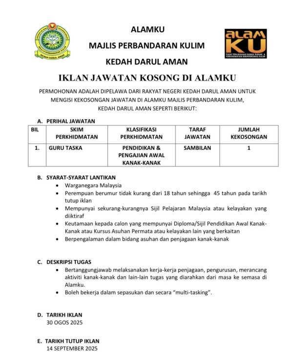 Iklan Kini Jawatan Kosong Majlis Perbandaran Kulim Like serta Ikut Facebook Kami, follow Chanel WhatsApp Jawatan Kosong & Telegram Portal SPA9 untuk capaian pantas kekosongan jawatan daripada kami sekarang. Klik Iklan Disini