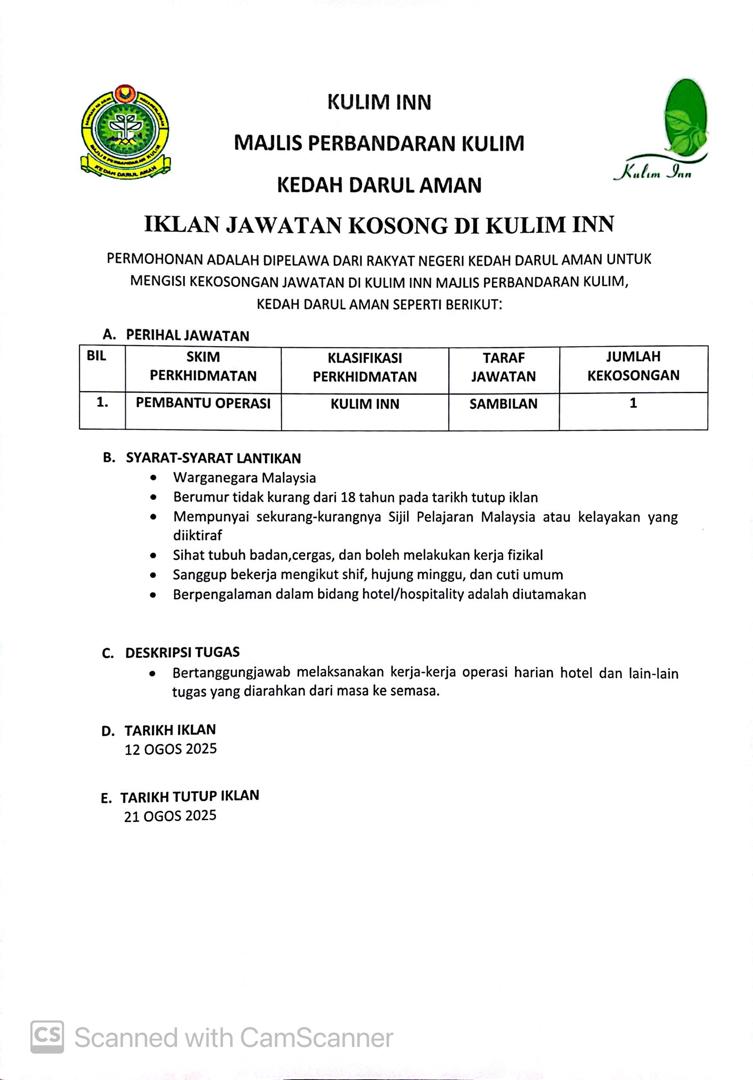 Iklan Kini Jawatan Kosong Majlis Perbandaran Kulim (Kulim Inn) Klik Iklan Disini Like serta Ikut Facebook Kami, follow Chanel WhatsApp Jawatan Kosong & Telegram Portal SPA9 untuk capaian pantas kekosongan jawatan daripada kami sekarang.