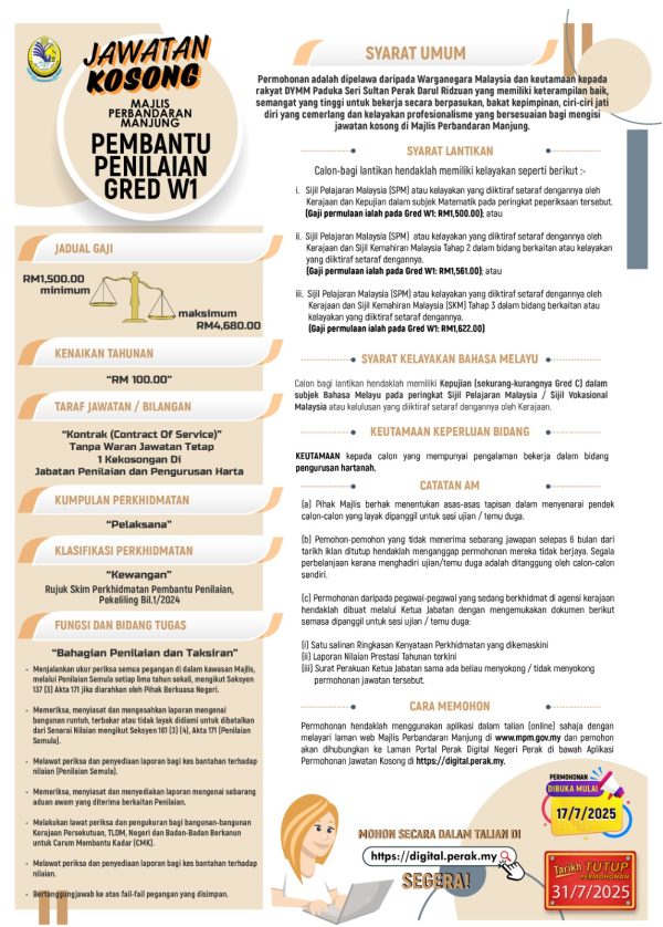 Iklan Kini Jawatan Kosong Majlis Perbandaran Manjung (MPM) Like serta Ikut Facebook Kami, follow Chanel WhatsApp Jawatan Kosong & Telegram Portal SPA9 untuk capaian pantas kekosongan jawatan daripada kami sekarang. Klik Jawatan Disini