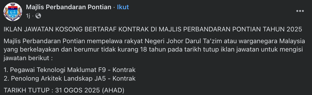 Iklan Kini Jawatan Kosong Majlis Perbandaran Pontian Like serta Ikut Facebook Kami, follow Chanel WhatsApp Jawatan Kosong & Telegram Portal SPA9 untuk capaian pantas kekosongan jawatan daripada kami sekarang. Klik Iklan Disini