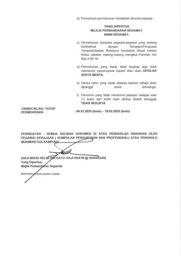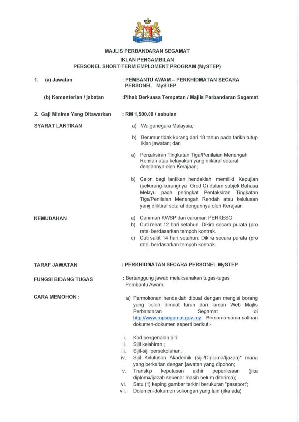 Iklan KIni Jawatan Kosong Majlis Perbandaran Segamat Klik Jawatan Disini Like serta Ikut Facebook Kami, follow Chanel WhatsApp Jawatan Kosong & Telegram Portal SPA9 untuk capaian pantas kekosongan jawatan daripada kami sekarang.