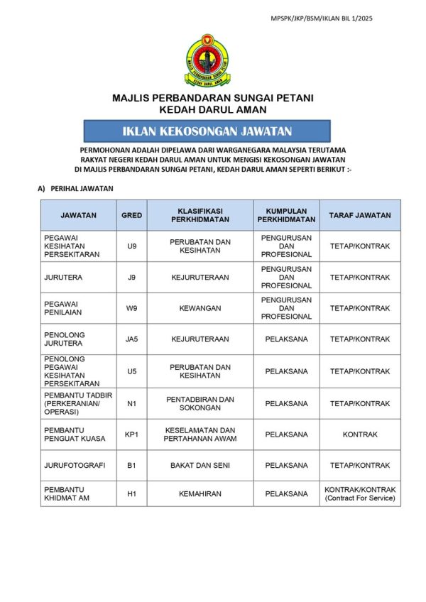Iklan Kini Jawatan Kosong Majlis Perbandaran Sungai Petani Klik Jawatan Disini Like serta Ikut Facebook Kami, follow Chanel WhatsApp Jawatan Kosong & Telegram Portal SPA9 untuk capaian pantas kekosongan jawatan daripada kami sekarang.