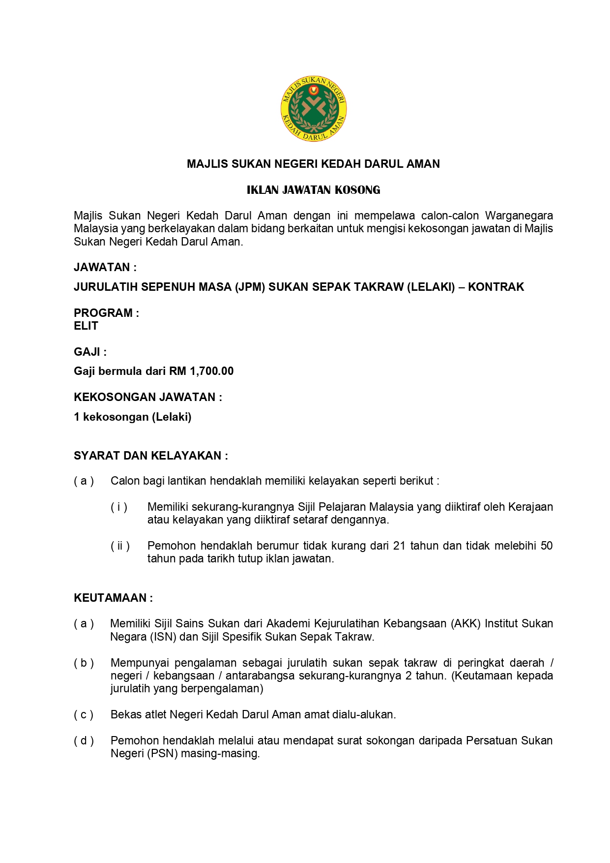 Iklan Kini Jawatan Kosong Majlis Sukan Negeri Kedah Darul Aman Like serta Ikut Facebook Kami, follow Chanel WhatsApp Jawatan Kosong & Telegram Portal SPA9 untuk capaian pantas kekosongan jawatan daripada kami sekarang. Klik Jawatan Disini