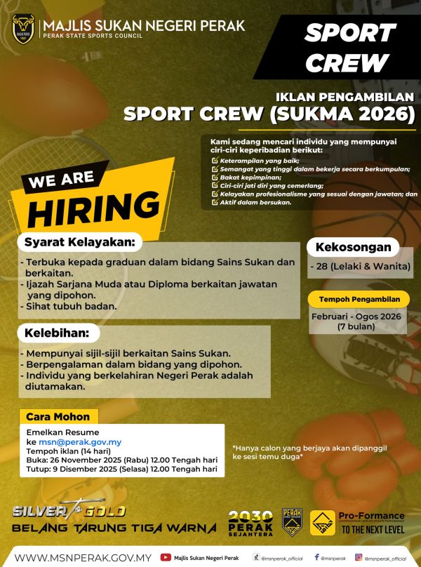 Iklan Kini Jawatan Kosong Majlis Sukan Negeri Perak Like serta Ikut Facebook Kami, follow Chanel WhatsApp Jawatan Kosong & Telegram Portal SPA9 untuk capaian pantas kekosongan jawatan daripada kami sekarang. Iklan Jawatan