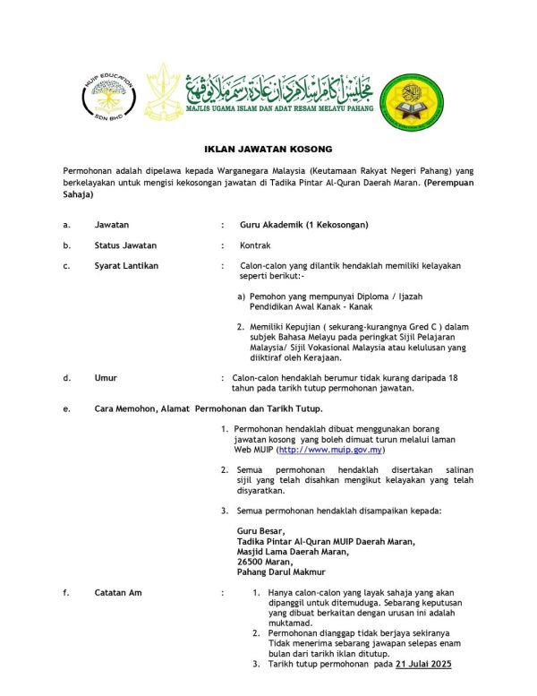 Iklan Kini Jawatan Kosong Majlis Ugama Islam dan Adat Resam Melayu Pahang (MUIP) Like serta Ikut Facebook Kami, follow Chanel WhatsApp Jawatan Kosong & Telegram Portal SPA9 untuk capaian pantas kekosongan jawatan daripada kami sekarang. Klik Jawatan Disini
