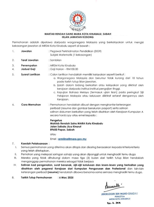 Iklan Kini Jawatan Kosong Maktab Rendah Sains MARA Kota Kinabalu Klik Jawatan Disini Like serta Ikut Facebook Kami, follow Chanel WhatsApp Jawatan Kosong & Telegram Portal SPA9 untuk capaian pantas kekosongan jawatan daripada kami sekarang.