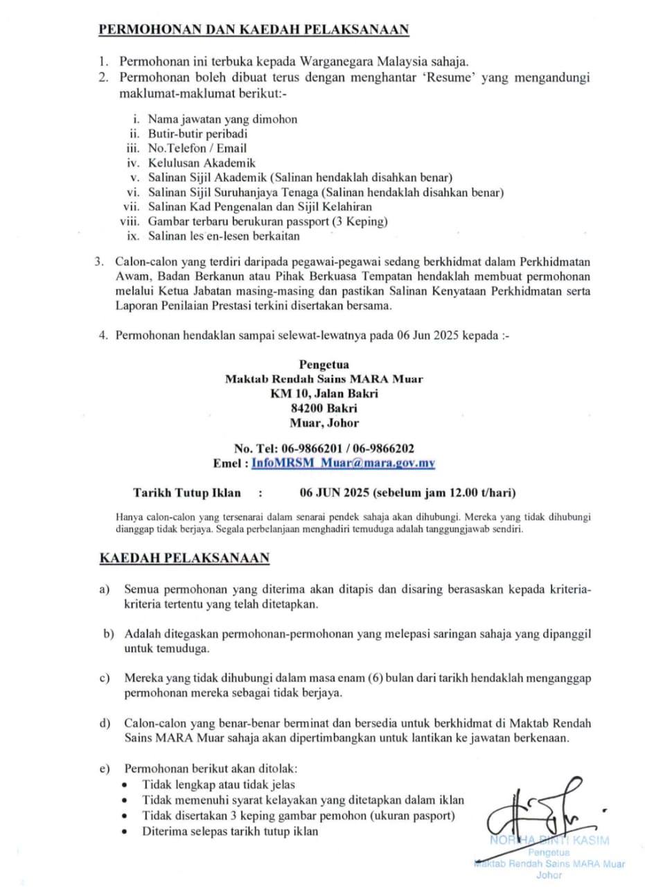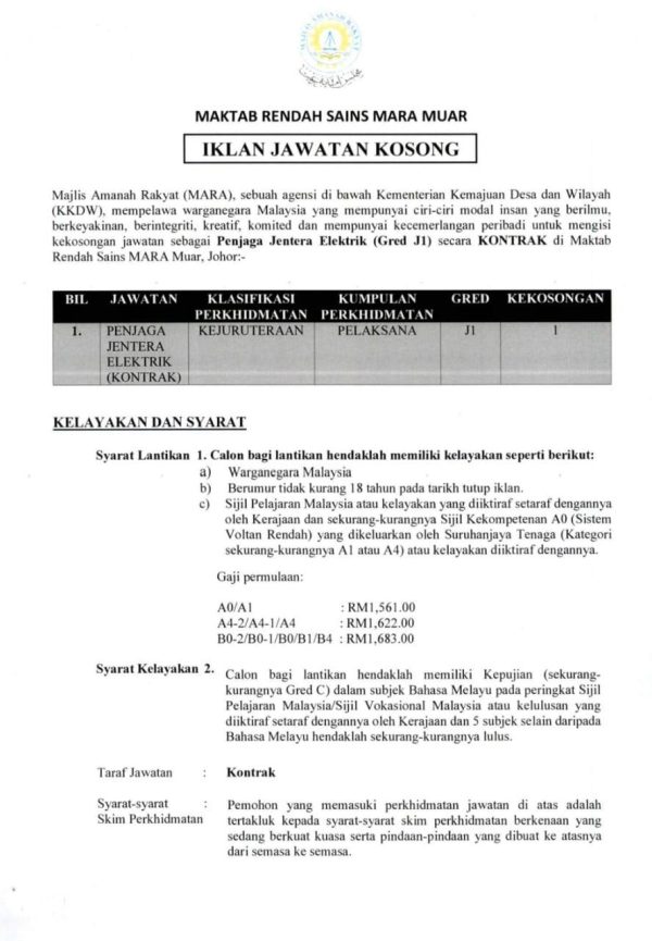 Iklan Kini Jawatan Kosong Maktab Rendah Sains MARA (MRSM) Klik Iklan Disini Like serta Ikut Facebook Kami, follow Chanel WhatsApp Jawatan Kosong & Telegram Portal SPA9 untuk capaian pantas kekosongan jawatan daripada kami sekarang.