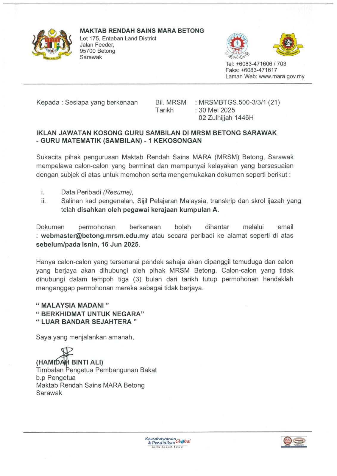 Iklan Kini Jawatan Kosong Maktab Rendah Sains MARA (MRSM) Betong