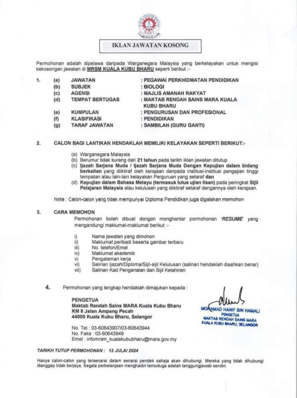 Iklan Kini Jawatan Kosong Maktab Rendah Sains MARA (MRSM) Kuala Kubu Bharu Like serta Ikut Facebook Kami, follow Chanel WhatsApp Jawatan Kosong & Telegram Portal SPA9 untuk capaian pantas kekosongan jawatan daripada kami sekarang.