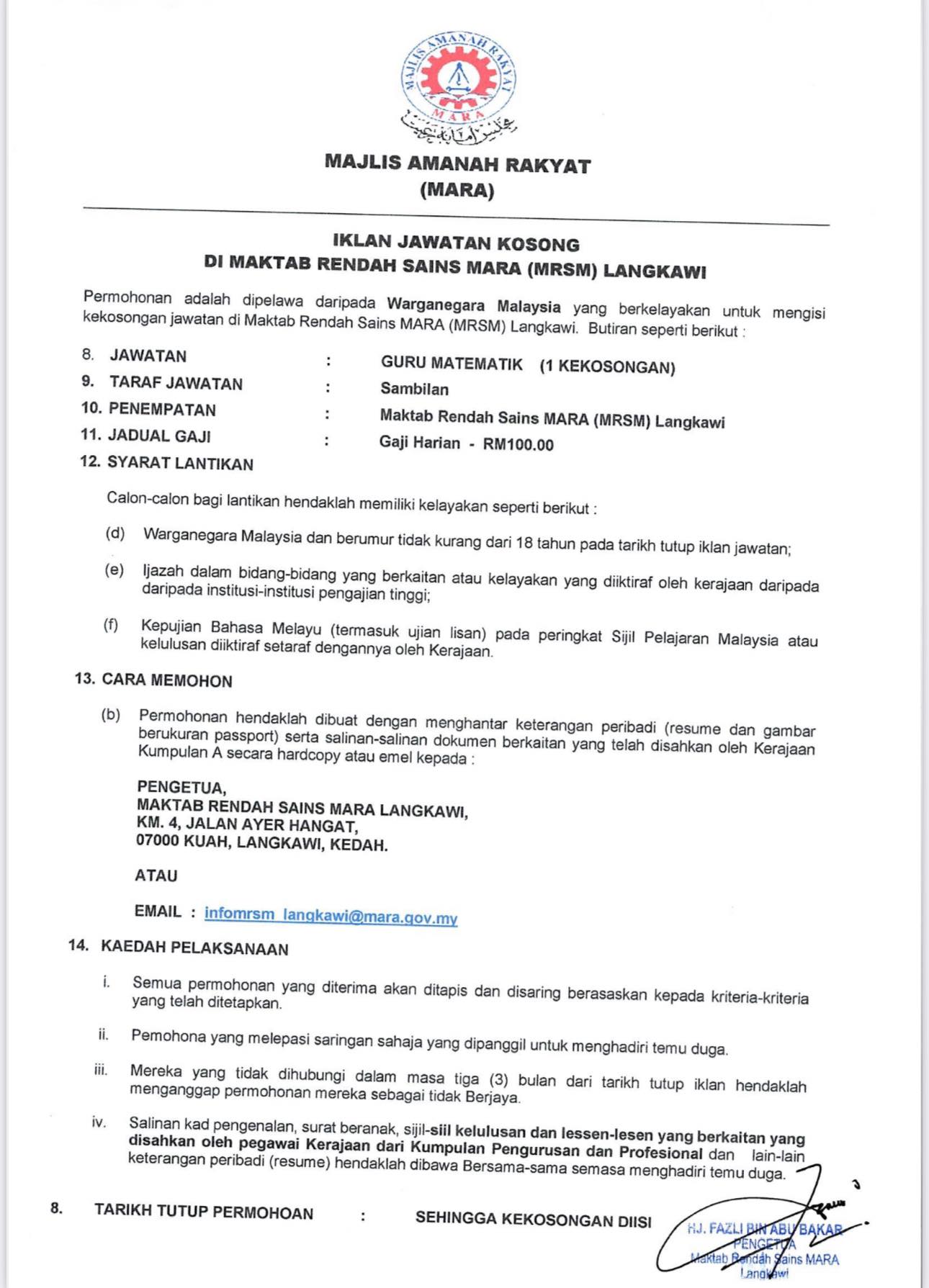 Iklan KIni Jawatan Kosong Maktab Rendah Sains MARA (MRSM) Langkawi Like serta Ikut Facebook Kami, follow Chanel WhatsApp Jawatan Kosong & Telegram Portal SPA9 untuk capaian pantas kekosongan jawatan daripada kami sekarang. Klik Jawatan Disini