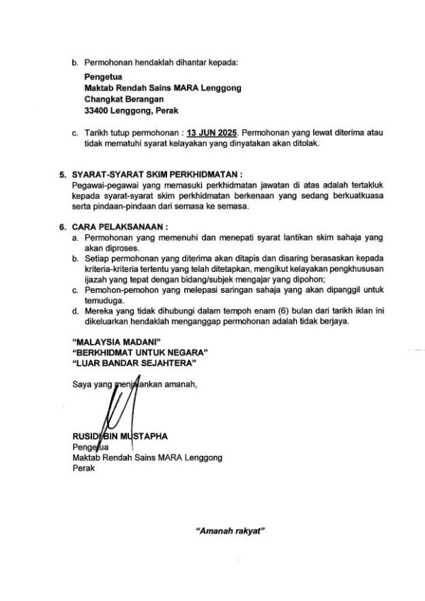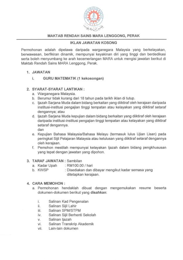 Iklan Kini Jawatan Kosong Maktab Rendah Sains Mara (MRSM) Lenggong Like serta Ikut Facebook Kami, follow Chanel WhatsApp Jawatan Kosong & Telegram Portal SPA9 untuk capaian pantas kekosongan jawatan daripada kami sekarang. Klik Jawatan Disini